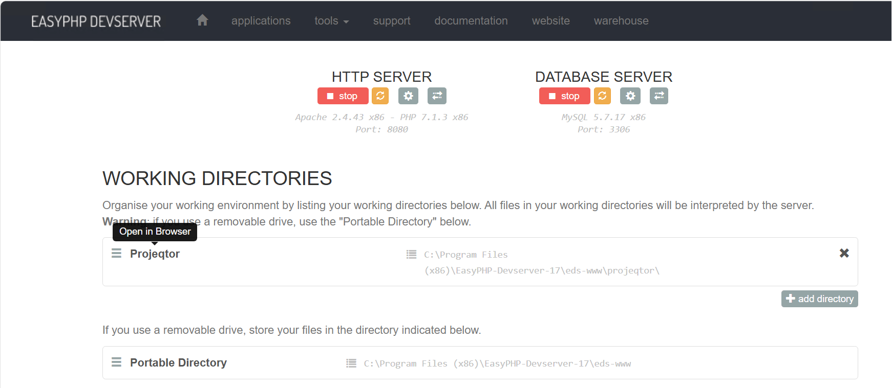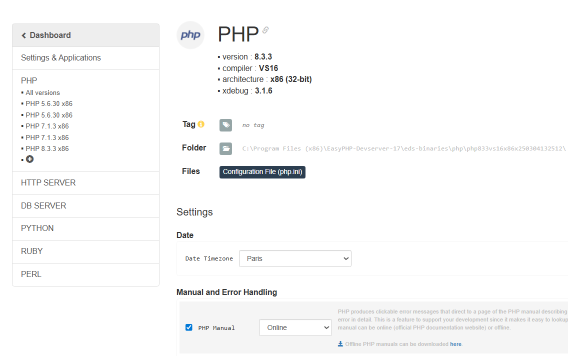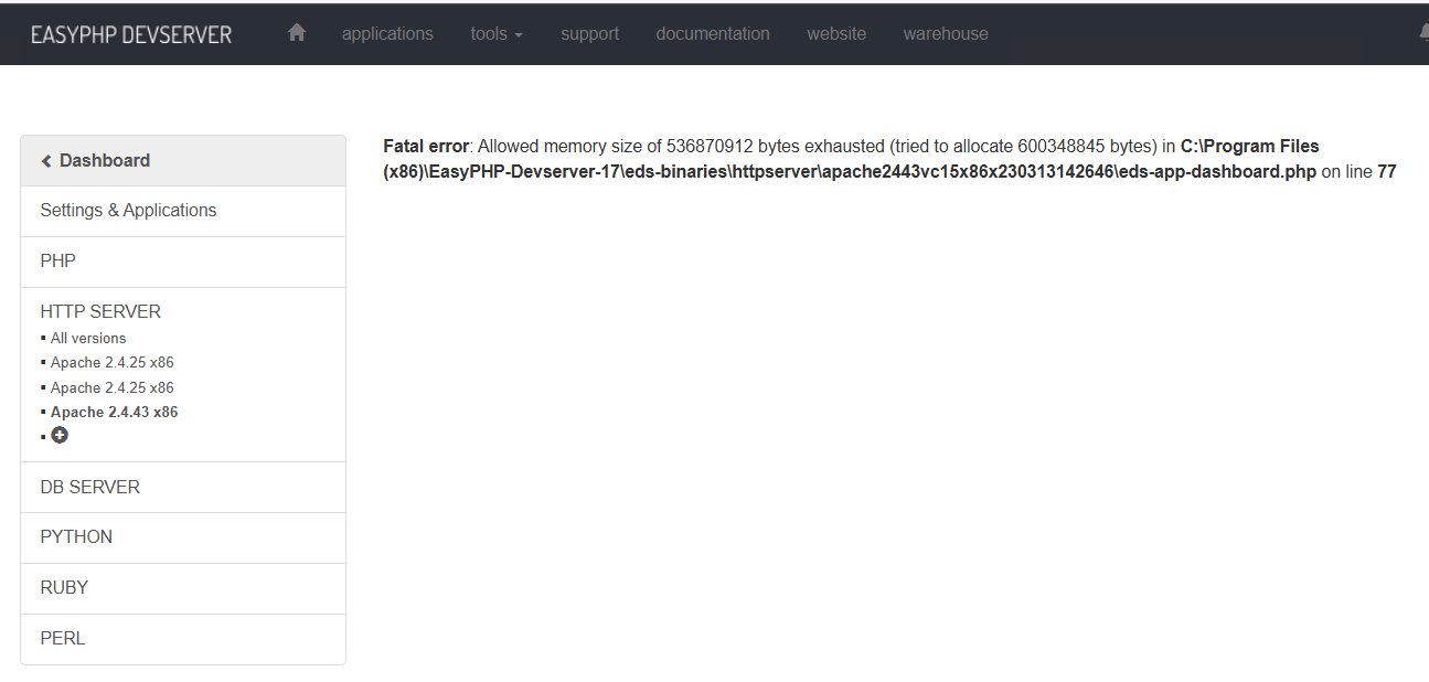 On the main screen it is written as Apache 2.4.43 x86, but in the server configuration screen when i select that server it produces an error like Fatal error: Allowed memory size of 536870912 bytes exhausted (tried to allocate 600348845 bytes) in C:\Program Files (x86)\EasyPHP-Devserver-17\eds-binaries\httpserver\apache2443vc15x86x230313142646\eds-app-dashboard.php on line 77.