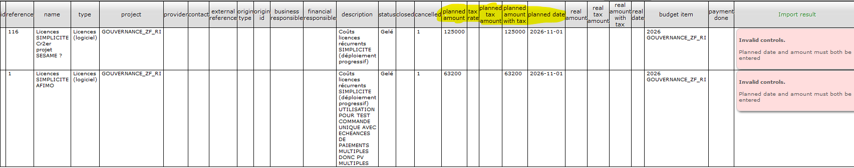 WHY error on planned date and planned amount while the are reading and report on result screen ???? NOTE that value 0 for real amount with tax, appearing in import with id doesn't appear anymore...